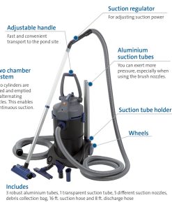 Watch VideosPonds that exude beauty and brilliance are healthy and well maintained. The PondoVac 4 is a robust pond vacuum that boasts effectiveness, efficiency and ease of use. It features a two-chamber system that enables continuous suction. The PondoVac 4 works quickly and efficiently – its 1800W motor allows for robust suction. With a maximum suction depth of 7 ft., the deepest points – where debris accumulates – become accessible. Its ergonomic handle, transport rollers and suction tube receptacle allow for easy portability to the pond or pool site. A 1.6 ft. transparent tube allows for easy visual inspection, and a debris collection bag is ideal for returning cleaned water when suctioning particles less than 1 mm. Accessories include: 4 suction tubes (3 black, 1 transparent), string algae nozzle, crevice nozzle, wet suction nozzle, adjustable floor nozzle, debris collection bag, 16 ft. long suction hose and 8.2 ft. long discharge hose.