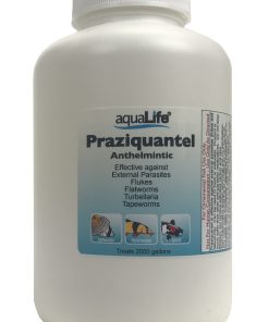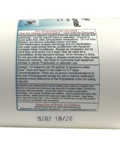 Praziquantel is effective against external parasites (flukes and flatworms). It can be used in fresh or saltwater. Product is much safer than other anti-parasitic medications. Do not stop filtration, but remove activated carbon and stop foam-fractionation (protein skimming) and UV sterilization. Any water used should first be conditioned with AquaLife Complete Water Conditioner. Repeat as necessary, but no more than once every 3 to 5 days. May be used as a preventative, at the standard dosage, when disease is likely. Do not use with other drugs or disease treatments. It may cause temporary foaming. It is non-toxic to commonly kept aquarium animals or plants. Praziquantel is intended for freshwater or saltwater use.
